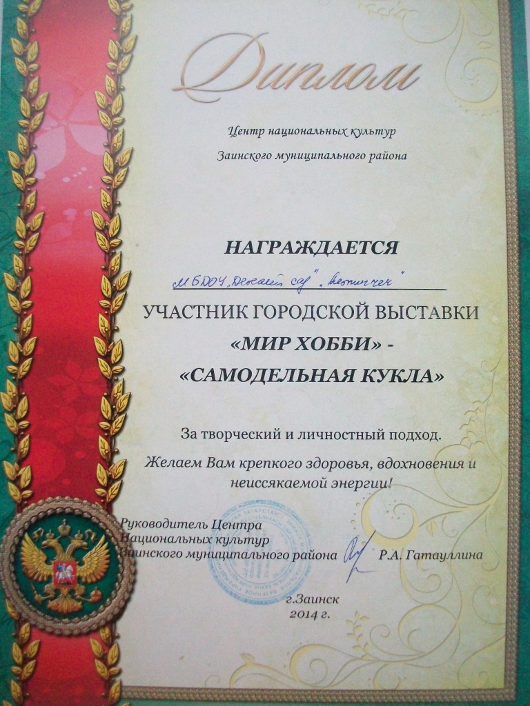 ДИПЛОМ ЗА УЧАСТИЕ В ФЕСТИВАЛЕ "САМОДЕЛЬНАЯ КУКЛА"