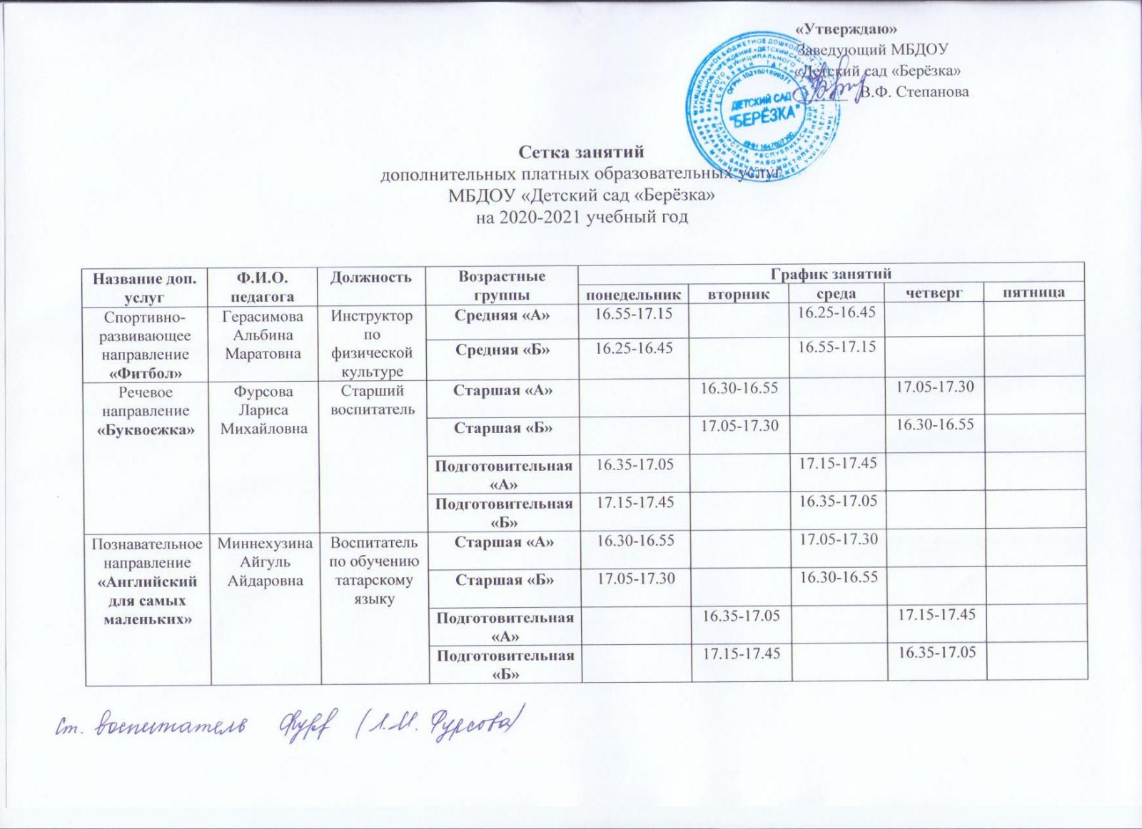 Сетка занятий дополнительных платных образовательных услуг на 2020-2021 уч.год