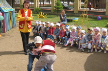 Вчера у нас пршёл "День Знаний" . Старшие группы ходили на экскурсию в школу, побывали на школьной линейке. Для ребят младшей группы был организован праздник, на который пришёл Домовёнок Кузя. Кузя играл с ними в разные игры, пел и танцевал. Дети были очень довольны.