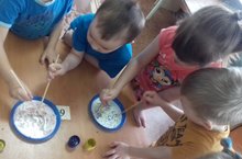 Дети с самого раннего возраста пытаются отразить свои впечатления об окружающем мире в своём изобразительном творчестве. Наблюдения за эффективностью рисования в детском саду приводят к выводу о необходимости использования нетрадиционных техник, которые создадут ситуацию успеха у воспитанников, сформируют устойчивую мотивацию к рисованию. Вот и в нашем детском саду дети средней группы познакомились с новой техникой рисования – «рисование на кефире». Дети с удовольствие выводили на кефире узоры разными цветами. Рисование нетрадиционными способами, увлекательная, завораживающая деятельность, которая удивляет и восхищает детей, дает возможность творчеству.