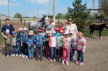 Воспитатель Матюшина Е. В. организовала для воспитанников старшей группы познавательную экскурсию на Конноспортивную базу нашего города. Ребята узнали там много интересного! Сначала экскурсовод подробно рассказала о том, как содержатся животные. Что каждая из лошадей имеет свой денник – помещение для содержания животного, что лошади просыпаются очень рано. Затем их кормят овсом и поят водой. После чего выводят в леваду, где они едят сено. Гуляют лошади на свежем воздухе около семи часов. В деннике же они находятся только ночью. Перед тем как отправиться на конюшню, экскурсовод объяснила детям, как себя нужно вести там. Наступил самый счастливый момент для детей, вот они на конюшне, где можно погладить лошадей и покормить их морковкой, которую ребята предусмотрительно взяли с собой из дома. Также им показали, как оборудован денник - отдельная секция в конюшне для каждой лошади. Ещё ребята узнали, что за день лошадь съедает 6-7 кг овса, примерно столько же сена и выпивает 6 вёдер воды.