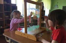 Одним из наиболее близких и доступных видов работы с детьми в детском саду является изобразительная деятельность. Она является важным средством эстетического воспитания, которое позволяет детям выразить своё представление об окружающем мире, развивает фантазию, воображение, даёт возможность закрепить знание о цвете, форме. Сегодня дети средней группы познакомились с прозрачным "чудо-мольбертом". Он помогает формировать у детей устойчивый интерес к изобразительной деятельности. В отличие от рисования по бумаге, стекло дарит новые визуальные впечатления и тактильные ощущения.