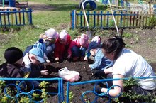 На протяжении всего учебного года воспитатель подготовительной группы Макурина Е.В. формировала интерес своих воспитанников к познавательной деятельности. Расширяла знания об условиях роста растений (свет, тепло, влага, почва) тем самым развивала любознательность, умение анализировать, воспитывала желание ухаживать за растениями, стремление украсить территорию детского сада результатом своего труда. Весь год мы с ребятами ухаживали за комнатным цветком (геранью), она так подросла, что к концу весны ей стало тесно в своем горшочке и мы решили ее пересадить к нам на участок , в подготовленную заранее клумбу, тем самым украсив свой участок.
