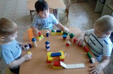 Дети 1 младшей группы, нашего детского сада, вместе с воспитателем Мартыновой Н.Р., очень любят сооружать различного вида постройки. И в этот раз, они решили построить домик из деревянного конструктора для маленьких зверушек (зайчика и лисички). Малыши выбирали кубики, каждый раз подбирая нужную деталь по размеру. Подставляя их один к другому. Построив домик, они перешли к постройке лестницы. Игра проходила намного интереснее тогда, когда маленькие зверушки могли подняться по лестнице в этот домик. И в конце воспитатель предложила послушать песенку о том, какой большой дом построили ребята.