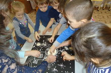 Известно, что рисование самое любимое занятие дошкольников. Рисовать можно чем угодно, любыми сыпучими продуктами. Но некоторые сыпучие продукты слишком растворимы. А вот рисование крупой – это очень интересное, познавательное и увлекательное занятие. Ребята старшей группы нашего детского сада уже делали простые и объёмные аппликации из бумаги, ватных дисков, семечек, картины из цветного песка. Но сегодня им захотелось попробовать что-то новое. Зима, всё белым-бело. Воспитатель Ходжаева Н. М. подвела детей к пониманию того, что земля как будто усыпана сахаром или манной крупой. Дети с любопытством и большим интересом приступили к выполнению коллективной работы с использованием нетрадиционной техники рисования манной крупой под названием «Зимний вечер». Вначале нанесли эскиз рисунка на картон черного цвета с помощью клея ПВА, а затем ребята посыпали узор манной крупой. Все получили положительные эмоции от общения и совместного творчества в процессе создания «шедевра».