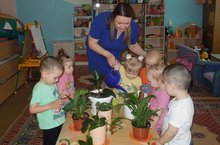 Любовь к природе, к растительному миру в детском саду «Солнышко» воспитывают у детей с малых лет. В ясельной группе воспитатель Ахмадиева Г.И. ознакомила малышей с комнатными цветами, рассказала и показала, как правильно за ними ухаживать и поливать. Дети с интересом наблюдали за работой воспитателя, с удовольствием ей помогали.