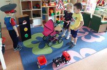 10 сентября дети средней группы играли в сюжетно-ролевую игру «На дорогах города». Дети закрепили знания о правилах дорожного движения, познакомились с новой ролью – регулировщик, закрепили знания цветов светофора, на какой цвет можно переходить дорогу, а на какой нет.