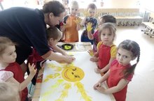 Именно так созывали солнышко воспитанники 2 младшей группы на очередном кружковом занятии «Юный художник». В коллективной композиции дети упражнялись в рисовании ладошкой: изображали с помощью ладошек солнечных лучиков. Солнышко получилось лучистое и доброе.