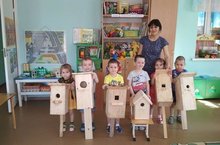 Не пролезет даже кошка.На днях была объявлена общегородская экологическая акция «Каждому скворцу по дворцу». Родители второй младшей группы тоже не остались в стороне. И сегодня нашему взору представились шесть новых красивых домиков для наших младших пернатых друзей.