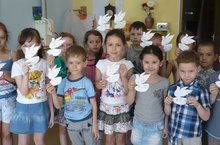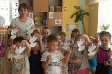 Приближаются праздники «Мира, труда и весны» - 1 Мая и 9 Мая «День Победы» этому и было приурочено занятие, проводимое 29 апреля в средней группе «Б». Целью занятие было развитие у детей высоких нравственных качеств - патриотизм: гордость за свою родину, прививать уважение к истории своего Отечества, к людям, защищавшим родной край в тяжелые годы войны; дать детям понятие о том, что белый голубь является символом мира. В процессе занятия воспитатель прочитал рассказ о голубях-героях «Голубчик», дети рассказывали стихи, рассматривали иллюстрации посвященные празднику 9 Мая и беседовали по их содержанию. Голубь является птицей, которая символизирует мир на всей планете, поэтому дети разукрашивали макеты голубей и совместно с родителями писали на них пожелания для наших ветеранов. Пожелание – это светлая энергия чувств и мыслей человека, летящая в форме голубя от сердца к сердцу. От сегодняшнего занятия дети были в восторге, узнали много интересного о наших героях-голубях.