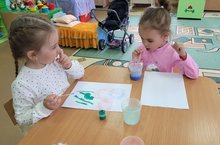 Воспитатель Тугашева Гульфия Хамисовна вместе с детьми второй младшей группы, с помощью нетрадиционной техники рисования, решили нарисовать цветы. Взяли баночку со смесью для пузыриков, малыши выдували шапочку из них, а воспитатель прикладывала лист сверху, чтоб отпечаток пузырей остался на бумаге. И так несколько раз. Каждый успел приложить ручки к нашим картинам. Затем зелёной гуашью дорисовывали листики и стебельки. Вот таким образом дети с помощью мыльных пузырей сотворили чудесные цветы. У кого то на рисунке можно увидеть букет из нарциссов, на другом воздушных тюльпанов, а на следующем сказочный сорт сирени.