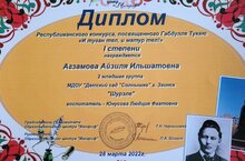 Воспитанники второй младшей группы, приняли участие в Республиканском конкурсе, посвященного Габдулле Тукаю "И туган тел, и матур тел!" и заняли призовые 1 места. Поздравляем!!!