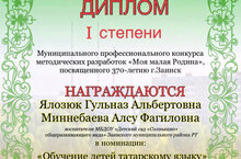 Воспитатели нашего детского сада приняли участие в муниципальном профессиональном конкурсе методических разработок "Моя малая Родина", посвященного 370-летию г. Заинск и были награждены Дипломами I, II, III степени. Поздравляем!!!