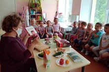 Самигуллина В.Р. с детьми 2 младшей группы провела беседу «Витамины и их роль в жизни человека». Дети узнали, как витамины влияют на организм человека, об их пользе и значении для здоровья человека. Отгадывали загадки про овощей и фруктов, играли в игру «Правильно, правильно, совершенно верно!», сделали физминутку «Капуста».