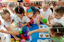 Сегодня к детям средней группы на НОД по ознакомлению с окружающим миром в гости пришёл любознательный Петрушка, который принёс разнообразные задания, вопросы разной степени сложности. Самым интересным заданием была карта с маршрутами испытаний, где находились дома разных цветов и корзинка с предметами, необходимые для отправления в волшебную страну профессий (шприц, халат, градусник, кастрюля, фартук, лейка, ножницы). Дети так увлекательно занимались и отлично справились со всеми заданиями.