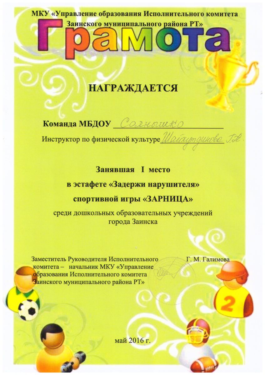 Грамота 1 место "Спортивная игра "Зарница-2016"
