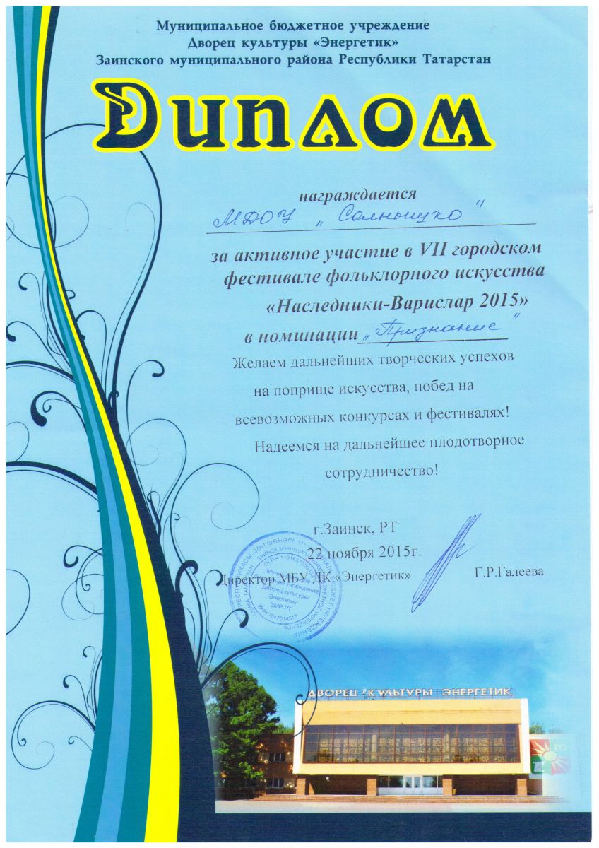 Диплом Фестиваль "Наследники-Варислар" 2015г..