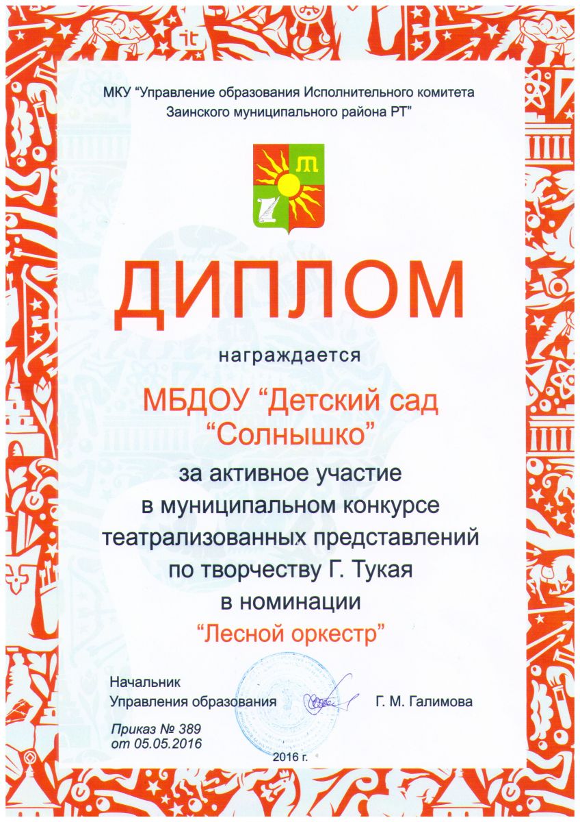 Диплом "Театрализованное представление по творчеству Г.Тукая" 2016г.