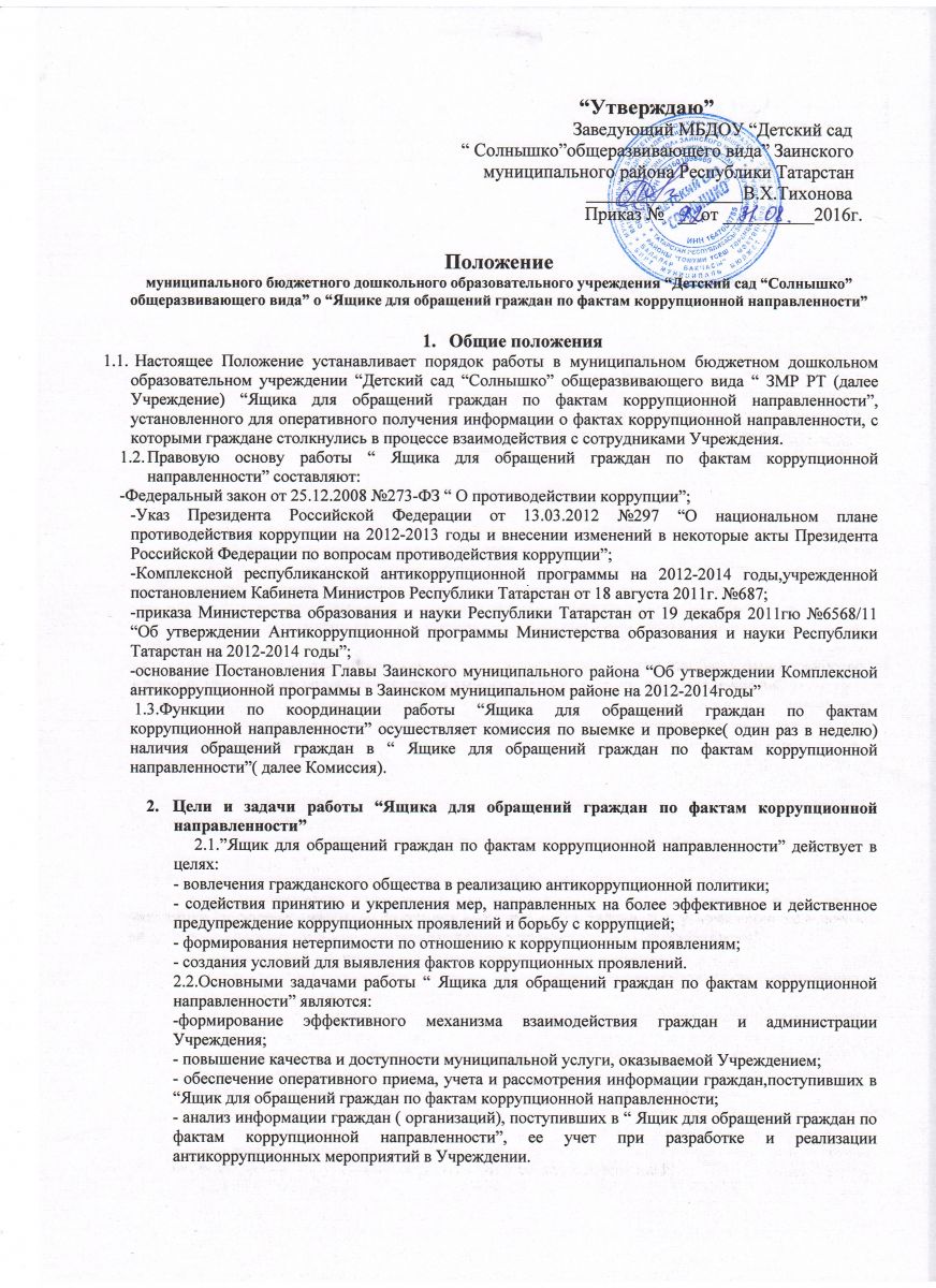 Положение о "Ящике для обращений граждан по фактам коррупционной направленности"