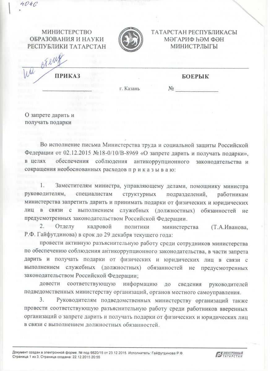 Приказ Мин.образования и науки РТ "О запрете дарить и получать подарки"