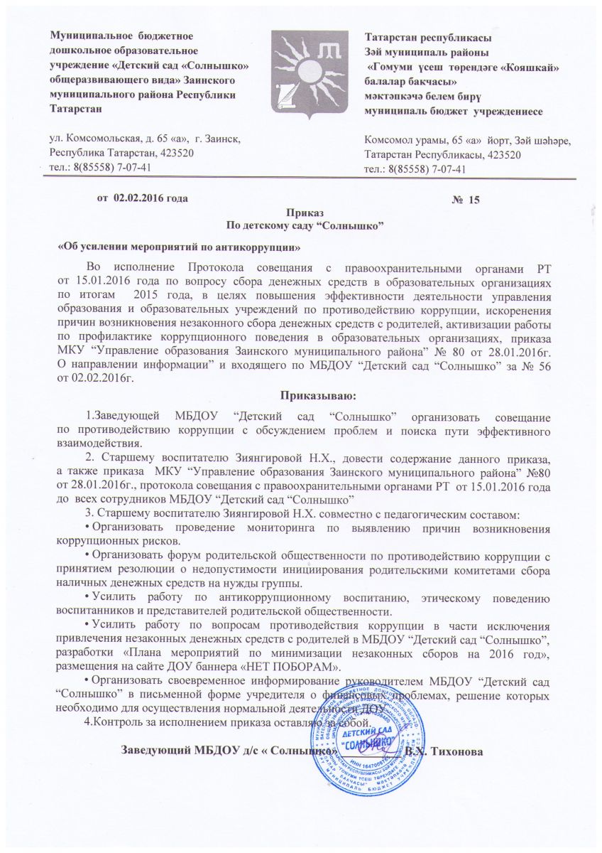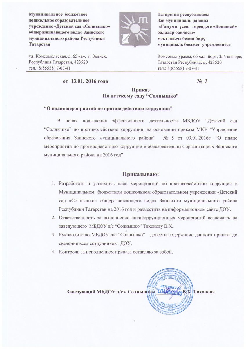 Приказ по МБДОУ № 7 от 10.01.2018г. "Об организации работы по противодействию коррупции"