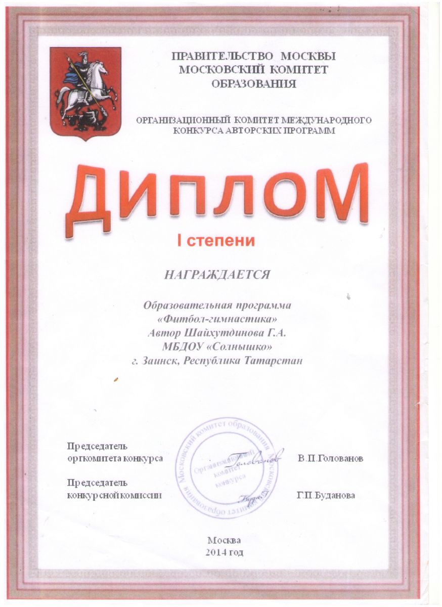 Диплом 1 степени к программе "Фитбол-гимнастика"