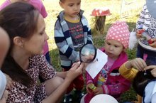 В траве сидел кузнечик,Совсем, как огуречик,Зелененький он был...Сегодня на прогулке дети второй младшей группы "Мышонок" вместе с воспитателем Гудошниковой А.П. Наблюдали за кузнечиком. С помощью увеличительного стекла и рассказа Анны Петровны дети познакомились с особенностями внешнего строения кузнечика. Наблюдая за насекомым дети узнали , что он прыгает, у него длинные ноги, что питается кузнечик пищей растительного происхождения.