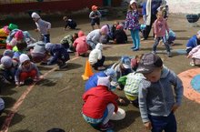 Рисуют дети на асфальте,Цветных мелков цветной полет,На голубом ковре из небаЛетит веселый вертолет.Дети сегодня побывали в гостях у яркой и красочной Палитры. Палитра поиграла с ребятами, провела познавательную викторину. А потом дети рисовали цветными мелками на асфальте. -