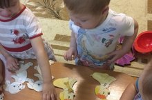 В подготовительной группе дети совершенствуют основные виды вырезания: разрезают бумагу строго по линии сгиба, а также визуально, закругляют углы квадрата или прямоугольника, добиваясь круглых и овальных форм, вырезают симметричные формы из сложенного пополам листа бумаги. Кроме того, воспитанники уже могут вырезать множество одинаковых элементов из сложенного в несколько раз материала. Происходит обучение такому сложному приему, как силуэтное вырезание (по линейному контуру), при этом ребенок должен держать в памяти целостный образ предмета и следить за правильностью его пропорций. В подготовительной группе коллективная аппликация проводятся довольно часто. Сегодня на занятии воспитатель Чупахина И.И. разделила детей на несколько подгрупп и каждой предложила придумать свой фасон одежды. Отметим, что ребята 6–7 лет уже способны самостоятельно распределить работу между собой без помощи педагога, в том числе определить последовательность приклеивания. На этом занятии дети познакомились с трудом портных. Узнали понятие выкройка и дружно составили групповую аппликацию. -