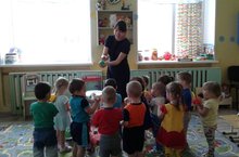 В 1-ой мл. группе "Зайчонок", малыши в ходе игровой ситуации учатся различать предметы по форме и цвету, а также формируют начальные представления о количестве предметов "много" и "мало".