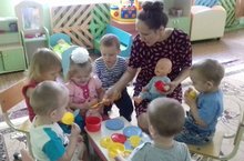 Игровая ситуация "Кукла Катя обедает". С помощью обыгрывания ситуации и чтения стихотворения Е.Благининой "Обедать" педагог первой мл.группы "Лисенок" А.П. Гудошникова помогает-малышам активизировать в речи названия столовых предметов, учит использовать-вежливые слова. В процессе игры у детей формируются игровые умения, обогащается социальный опыт.