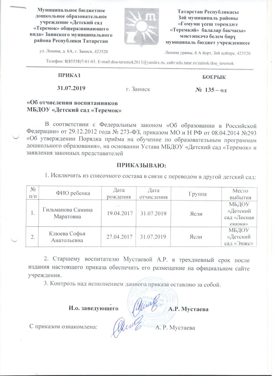 Пр.№135-од от 31.07.2019г. отчислены из яслей - 2 воспитанника
