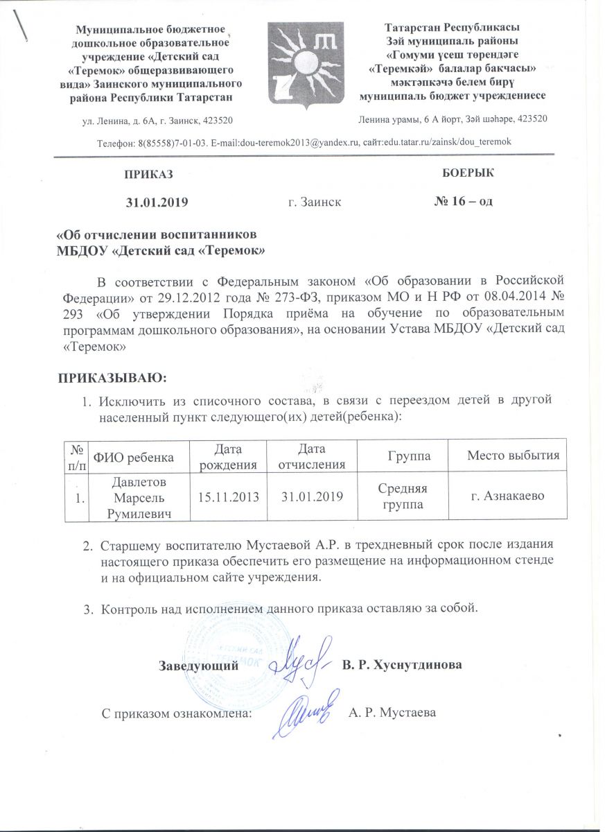 Пр.№95-од от 31.05.2019г. отчислены из старшей группы - 1 воспитанник, из подготовительной к школе группы "А" - 21 воспитанник, из подготовительной к школе группы "Б" - 19 воспитанников