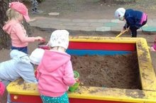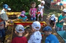 В летний период самое благоприятное время для игр с песком. Песок несет в себе творческое, эмоциональное развитие ребенка, развитие тактильных ощущений, моторики, пластики. Воспитатели группы «Жемчужинки», учат своих воспитанников пересыпать песочек из одной ладошки в другую, делать горочки, утрамбовывать (прихлопывая по нему). Малыши делают первые шаги в рисовании палочками по песку, изображая дождик, травку. Эти же палочки используются и как заборчик, лес, если воткнуть их в песок. Такие игры и упражнения знакомят детей с окружающим миром, обогащают тактильный опыт, влияют на развитие мелкой моторики, фантазии.