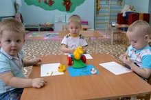 Воспитанники первой младшей группы «Теремок» на образовательной деятельности по художественно-эстетическому развитию «угощали утят крошечками», которые они сами слепили из пластилина.