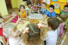 За то проснувшись, работа закипела ещё быстрей и и веселей: из готового теста малыши наперебой вырезали "птичек" и ловко размещали тесто на большом противне... Ожидание длилось недолго - через 15 минут вкуснейшее лакомство было готово !