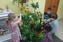 В нашем детском саду дети активно ухаживают за комнатными растениями: рыхлят их, поливают, моют, опрыскивают и вытирают листочки влажной тряпочкой. -