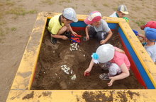 Старшие - помогали воспитателю набрать песок в песочницу.