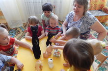 А с малышами сотрудники детского сада говорили о строении кошки: ребята показывали глазки, ушки, хвостик, лапки. Рассматривали иллюстрации, учились собирать кубики с изображением кошечки.