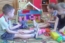 Начинают строить дом.Сегодня мы с малышами учились строить из конструктора домик для зверят, обыгрывали различные ситуации вокруг домика со зверюшками и мелкими предметами. Ребята с удовольствием, дружно занялись постройкой.