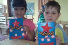 Самая главная часть открытки «Звезда» была выполнена в технике оригами. Ветка сакуры была самой интересной задачей для детей. Дети фантазировали, как лучше разместить цветы на ветке эта было увлекательно. Последним этапом работы детей было приклеить надпись «С Днем Победы!». Заключительную часть георгиевскую ленту с помощью воспитателя дети приклеили на специальный клей.