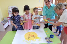 Дети вместе со взрослыми рисовали лучики из своих ладошек на солнышко. Какое красивое солнышко получилось! Пусть оно согревает наши сердца!