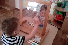 Стеклянный мольберт появился во 2 младшей группе «Гномики» и сразу привлек внимание детей. Ведь это необычное рисование. Рисунок на мольберте со стеклом, в отличие от рисования на бумаге дарит новые визуальные впечатления и тактильные ощущения. Сам процесс захватывает, поскольку используемые изобразительные средства скользят мягко, не впитываются в поверхность, их можно размазывать кистью, пальцами, ладошками, кусочками поролона. Рисовать можно красками, фломастерами, восковыми мелками, зубным порошком. Рисуя на стекле, ребенок приобретает коммуникативные навыки, восполняет дефицит общения, у детей развивается цветовосприятие. А главное в процессе восприятия и отображения развивается речь и мышление.