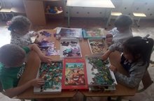 Дети средней группы «Смешарики» очень любят собирать пазлы. Иногда ребята даже соревнуются между собой, кто быстрее соберет. Все очень стараются, в процессе выкладывания деталей участники очень внимательны и крайне сосредоточены. Как всегда, побеждает дружба. Этой игрой увлекаются и девочки, и мальчики.