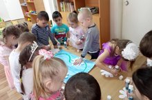 Воспитатель Надежда Фёдоровна предлагает игру из манной крупы. Манка обладает свойством погашения негативной энергии. Она очищает энергетику ребенка и стабилизирует его эмоциональное состояние. Играя с манкой, ребенок пропускает её между пальцев, вместе с потоком манки уходит напряжение, ребенок расслабляется и его эмоциональное самочувствие улучшается. Это служит прекрасным средством для развития и саморазвития детей. В процессе игры с манкой у детей развивается тактильно-двигательная чувствительность, координированные движения кистей и пальцев рук, что способствует успешной работе по подготовке руки к письму, по формированию навыков самообслуживания и предметно-практической деятельности. Благотворное влияние оказывает и на развитие речи, и на формирование навыков общения, и на взаимодействие между собой.