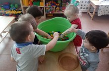 Для таких игр в ясельной группе используют маленькое ситечко, миску, различные цветные игрушки. Малыши вылавливают игрушки при помощи ситечка и кладут их в миску.