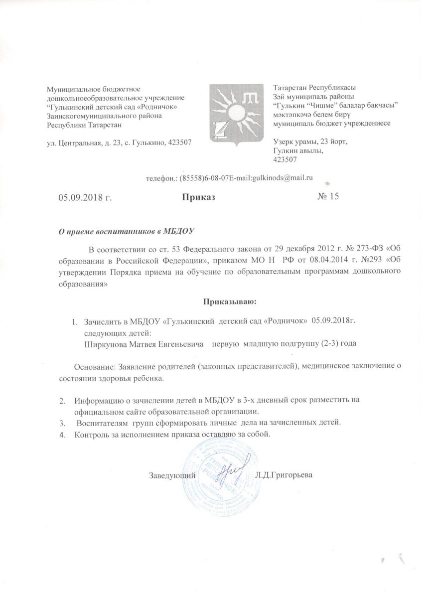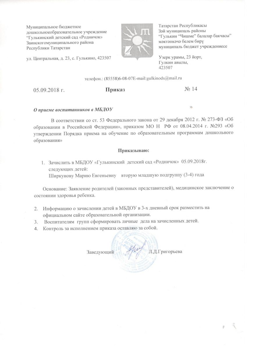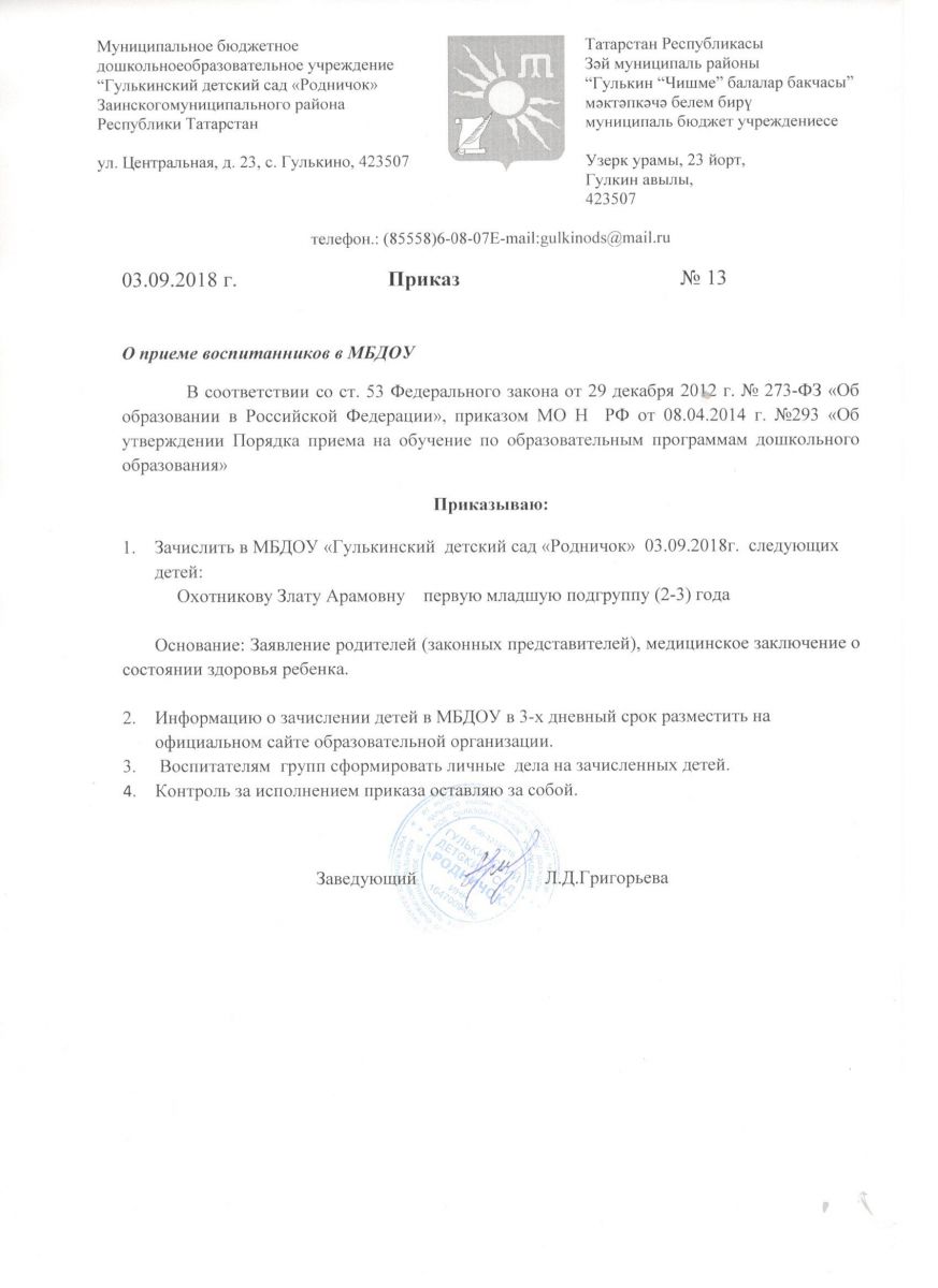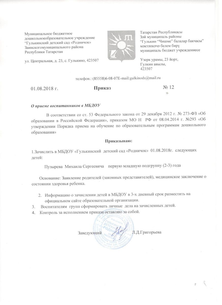 приказ о приеме воспитанников №12 от 03.09.2018г.