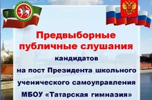 26 сентября 2016 года в гимназии состоялись публичные слушания предвыборных программ кандидатов, баллотирующихся на пост Президента ученического самоуправления гимназии. В этом году в предвыборной гонке принимают участие 5 гимназистов: Шарипова Гульназ (8 класс), Зюганова Илья (9 А), Хуснутдинова Камила (9 Б), Галиева Миляуша (10 класс) и Борисов Сергей (11 класс). Каждый из кандидатов очень ответственно подготовился к слушаниям. Ребята лаконично и грамотно познакомили всех присутствующих со своими программами, направленными на качественное улучшение школьной жизни учащихся и педагогов гимназии. Завершилось мероприятие выступлением действующего президента ШУС Хаевой Диляры которая пожелала всем кандидатам достойной предвыборной гонки, победы в выборах и дальнейшей плодотворной работы. -