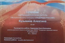Поздравляем с Победой ученицу 9 класса Кузьмину Алевтину в III Всероссийском конкурсе "Надежды России". Желаем дальнейших творческих побед!