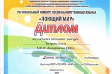 Поздравляем дипломанта регионального конкурса песни на иностранных языках "Поющий мир" Закирову Азилю! Молодец! Дальнейших творческих успехов, Азиля! 09.01.2023